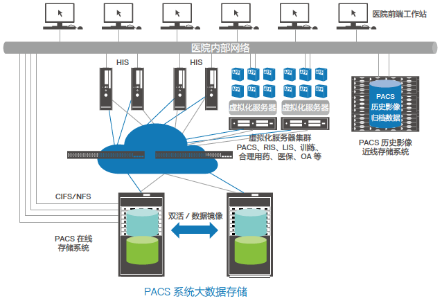 LEYU乐鱼针对医院 PACS 系统中海量医学影像数据管理、业务连续性要求高和性能要求一般等特点,对PACS系统的数据库存储,提供 SAN+NAS 统一存储解决方案;
